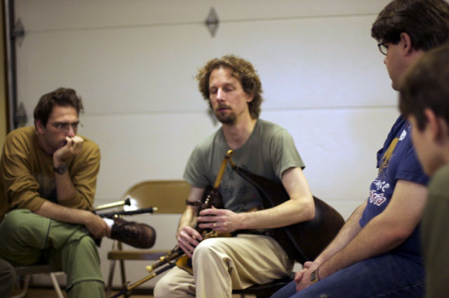 Joey Abarta displaying in fine style his brand spankin' new concert pitched set by Michael Hubbert. Congratulations Joey (and Mr. Hubbert) they are beautiful. Michael Eskin joins Joey here also for a few tunes on his Koehler & Quinn chanter and Kirk Lynch ¾ set. We have a visiting piper here also by the name of Robbie Byrne. Robbie is playing a Andreas Rogge full set with a Dave Williams chanter. Looking forward to having a few tuens with you Robbie at some point. |